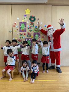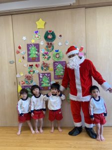誕生日会の後はクリスマス会をしました🎄マジックショーでミニサンタ🎅が登場し、メッセージで「うしろ」とあったので、見て見ると本物のサンタさんが👀サンタさんの登場に興奮するお友達🎅サンタさんと宝探しをし、製作で作ったツリーにみんなで飾り、最後にはサンタさんと写真も撮ることができて大満足なお友達です😊